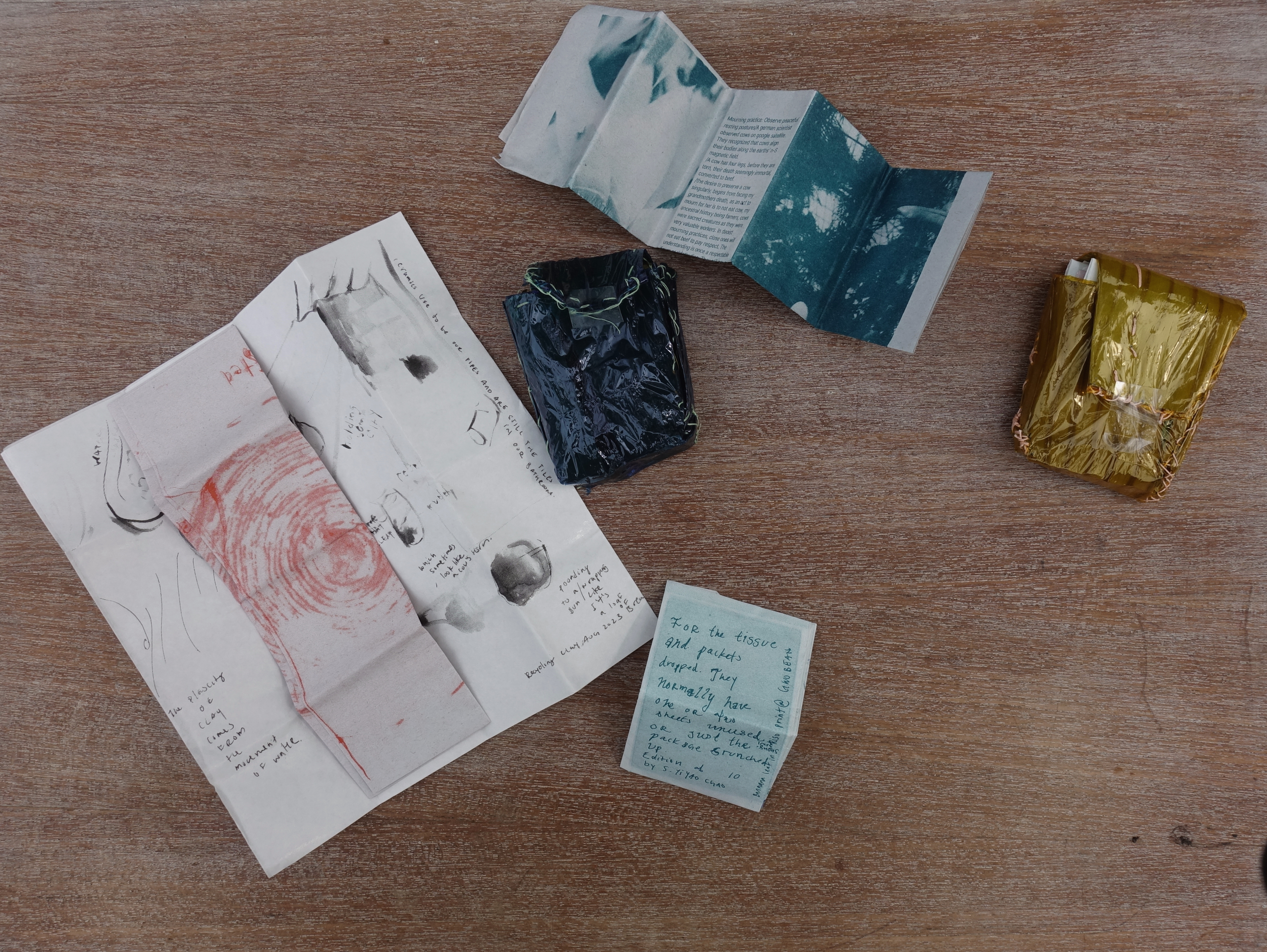 A four page loose leaf paper folded into a tissue packet; made from banana leaves and plastic sheets.