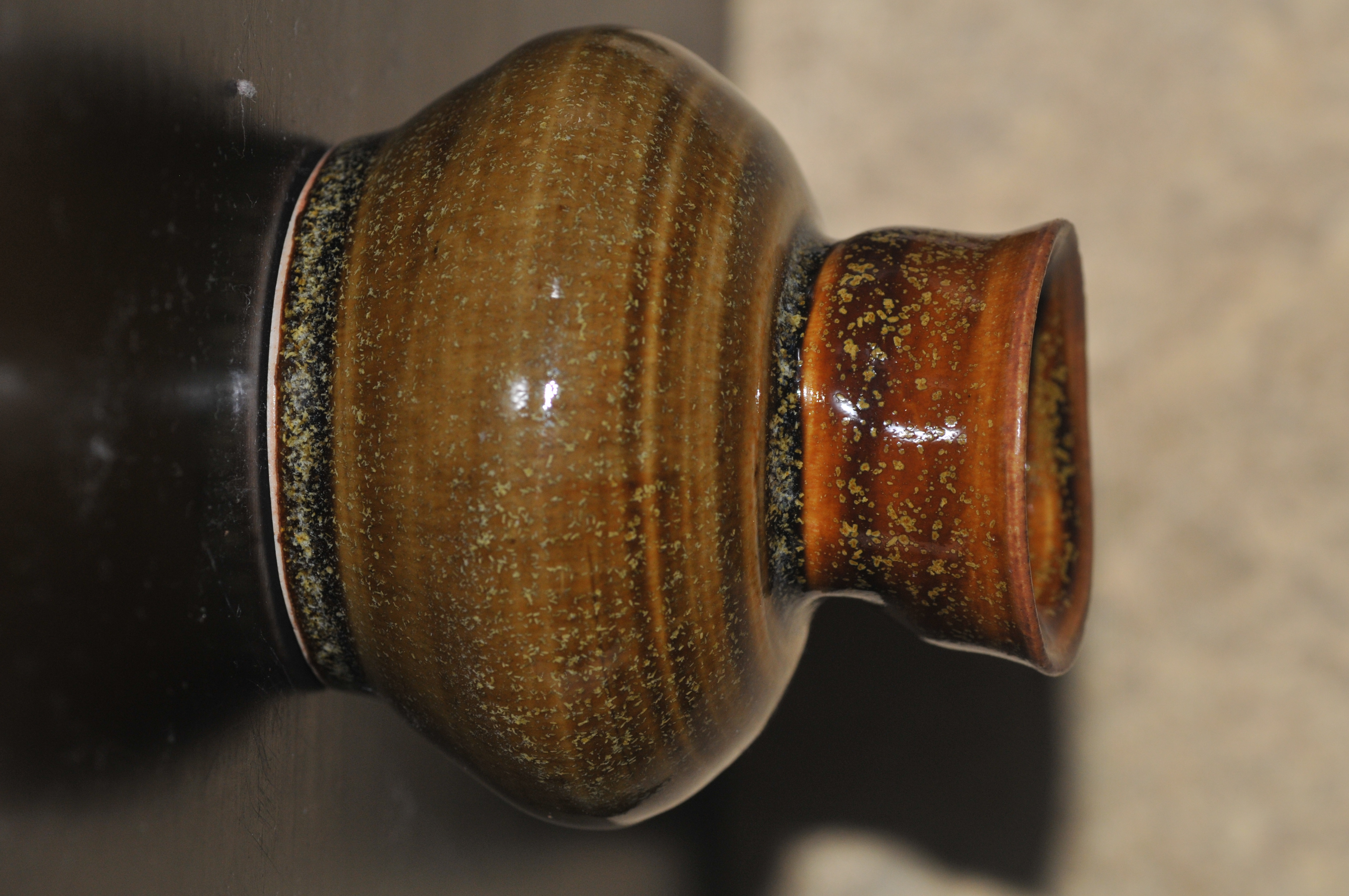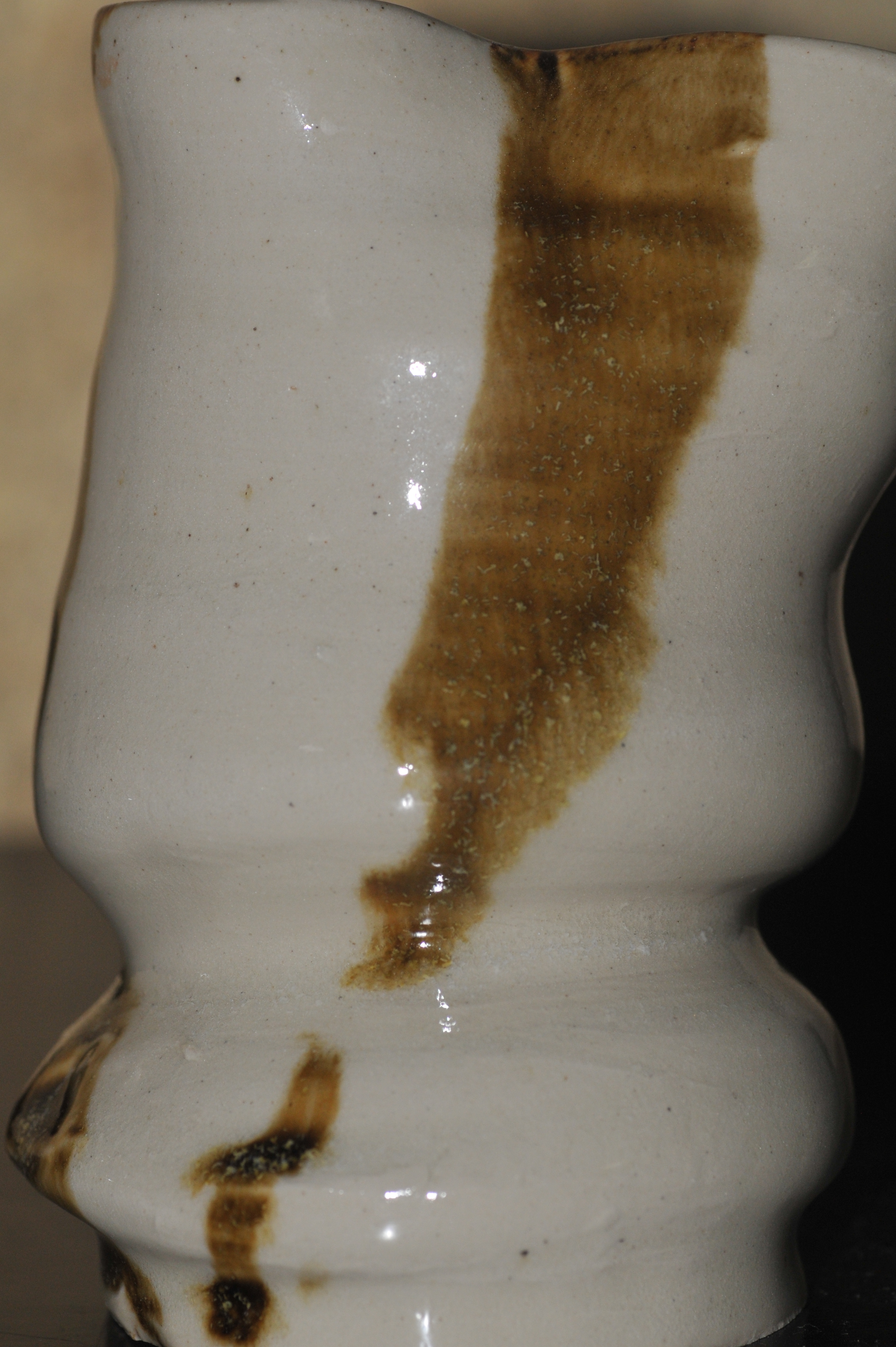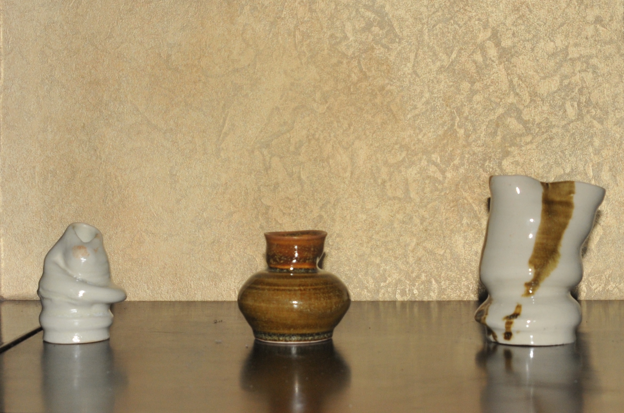 Glaze is mixed by ceramic studio, in variation of the 3 dippings. It was 2 layers of white and a brown layer. The reaction that gave it specels or a mold aesthetic. Dipped in awkard angles( for the white tiny one there is pink detail from the finger holding the vessel)